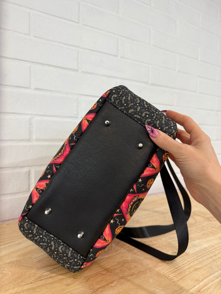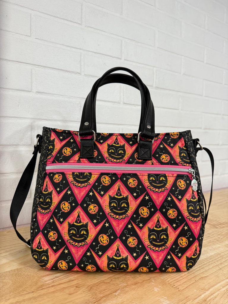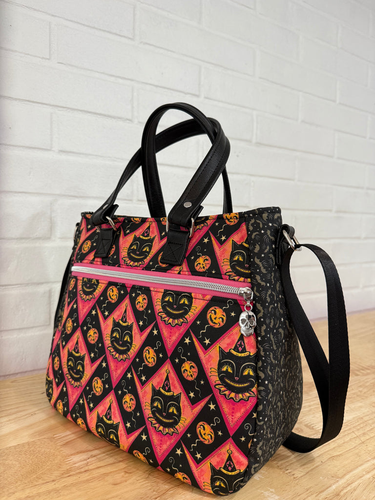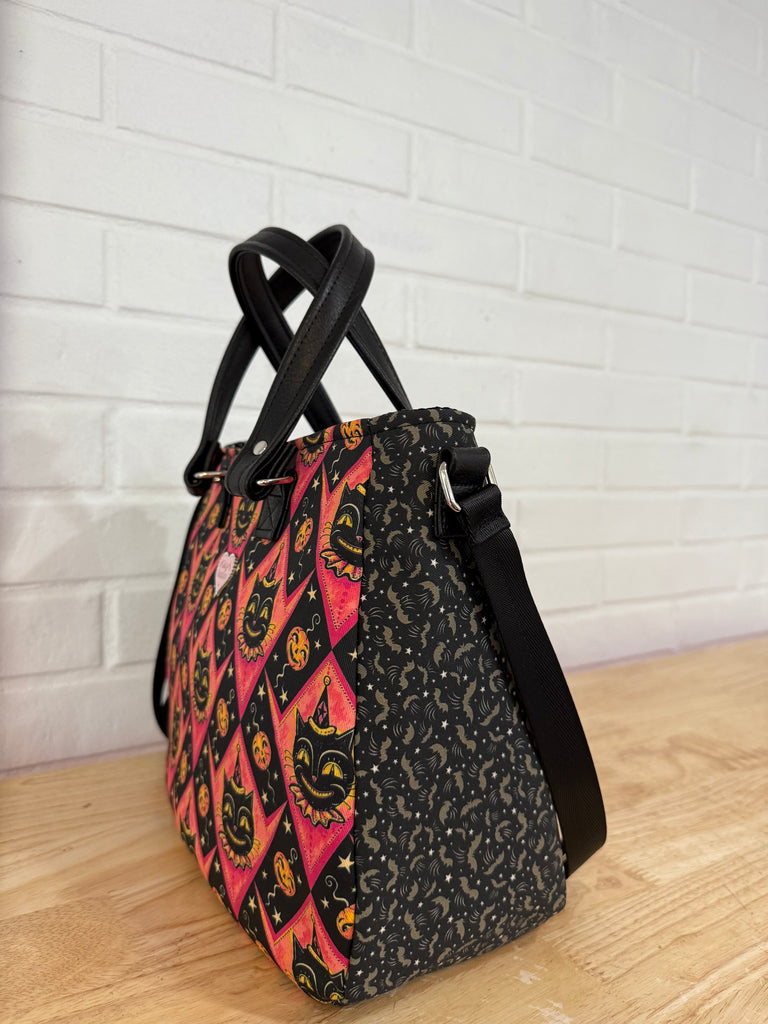 Here is the Evelyn Bag showcasing a combination of her Grinning Cats & Jacks fabric in pink with her wild bats in grey !